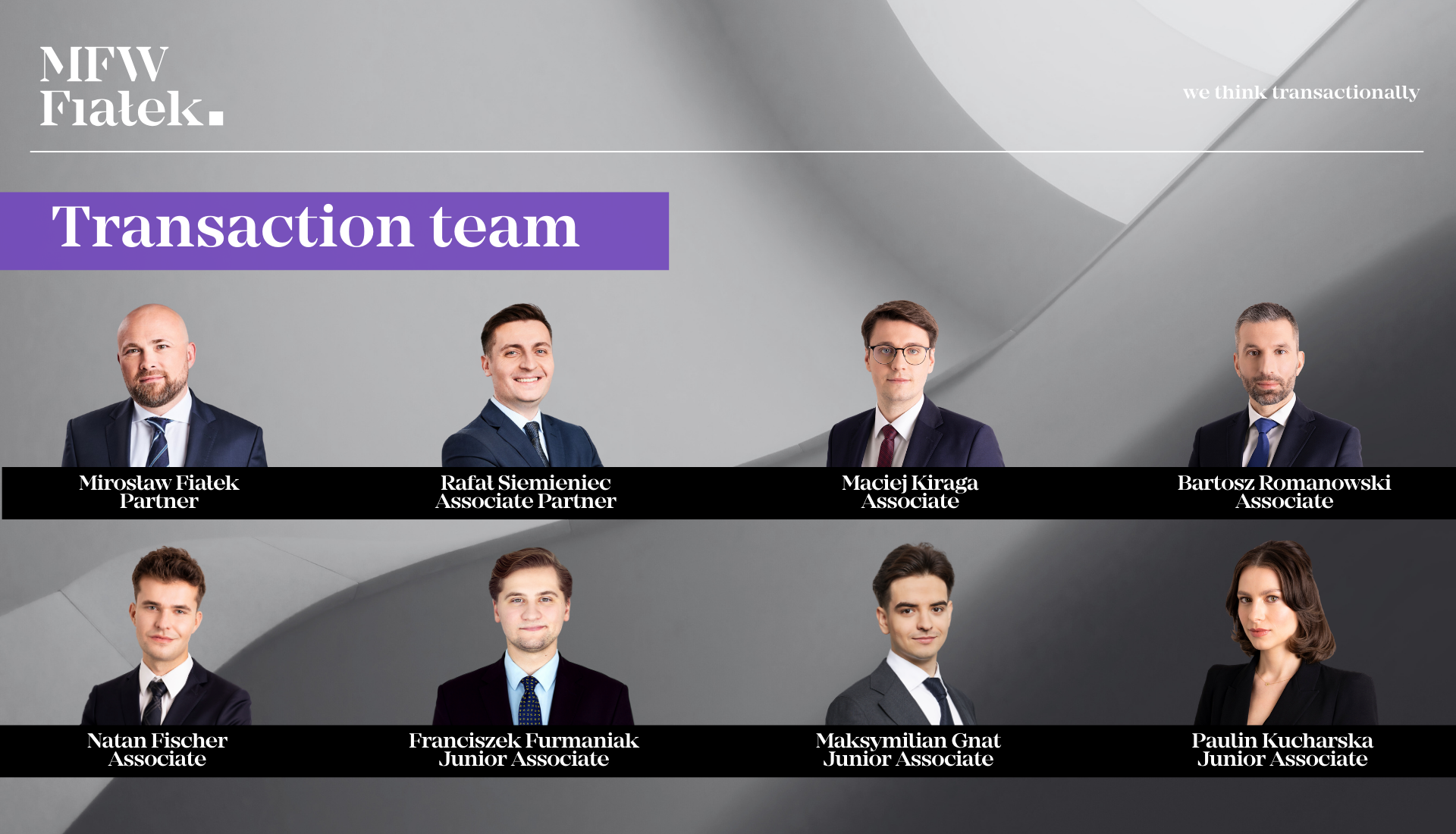 The team was led by Mirosław Fiałek – Partner, and Rafał Siemieniec – Associate Partner. The transaction team also included Maciej Kiraga – Associate, and Franciszek Furmaniak – Associate. The due diligence team additionally included Bartosz Romanowski – Associate, Natan Fischer – Associate, Paulina Kucharska – Junior Associate, and Maksymilian Gnat – Junior Associate.